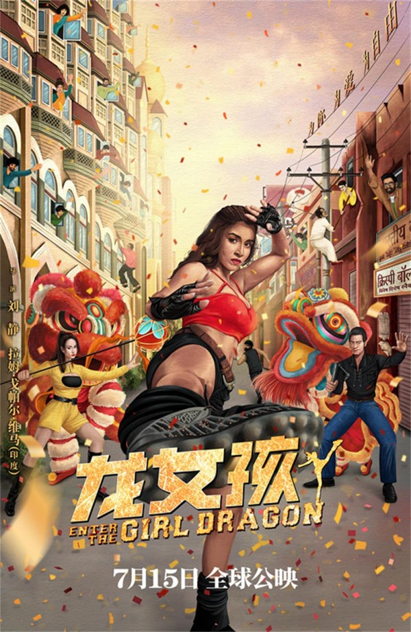 《龙女孩》剧照影片官方于当日同步发布了一张融合中印两国风情的海报,整体手绘海报以充满活力的高饱和色为基调,在极具印度风情的街道上,两只中国传统舞狮看着颇为威武,背景处漫天彩纸飞舞,好像是欢庆着胜利一般。而在画面的正中央,便是飞起一脚的“龙女孩”普加!她凌厉的招式仿佛李小龙的腾空飞踢,充满致敬意味。