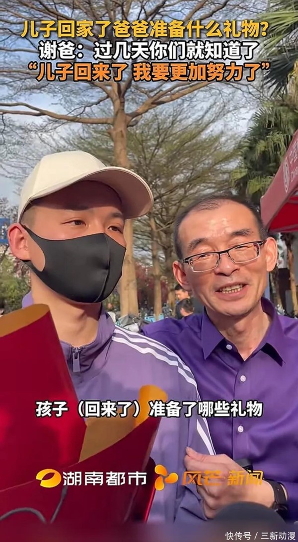 2025年3月14日到深圳的谢浩男摘下帽子,露出稀疏的头发,和爸爸谢岳站在一起,像复制粘贴的模板。
