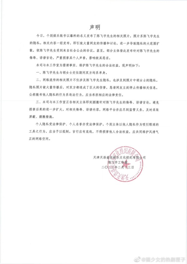 #陈飞宇方回应# 陈飞宇事件双方都已经发声明澄清了,当时是两人在单身前提下的正常交往!单身男女谈过恋爱而已!到处非法传播他人隐私照片就太过分!#陈飞宇方称交往时双方均系单身#