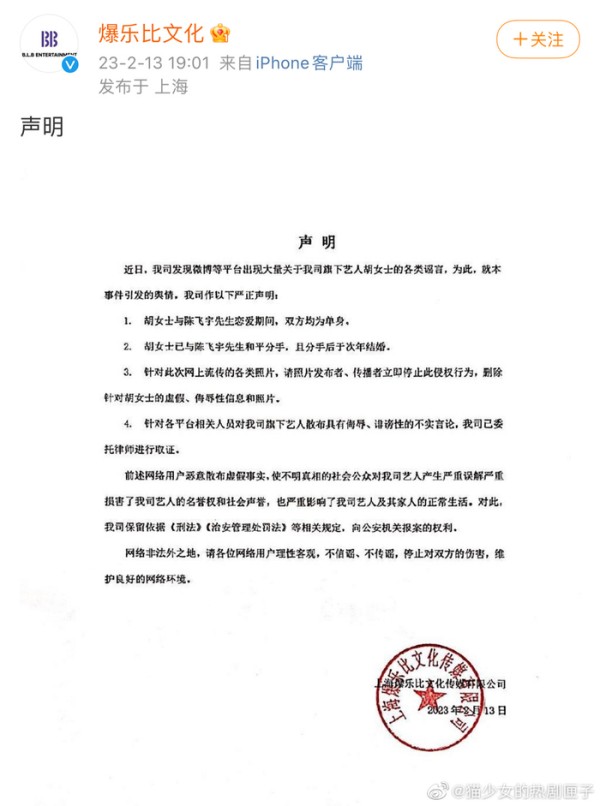 交往过,不是男小三,陈飞宇隐私照后续,工作室澄清来了