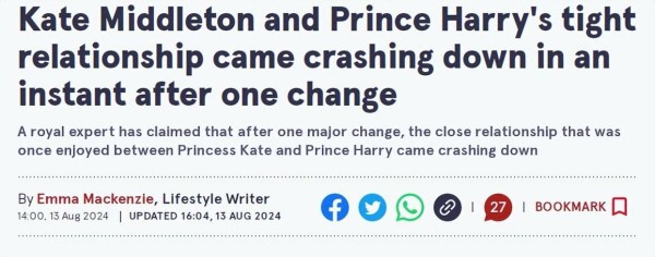 罗伯特·乔布森表示,凯特和哈里的关系自两人初次相识就十分亲近。但随着梅根的加入,这段关系的氛围产生了变化。在哈里的畅销书《备胎》中,他详细描述了自己与嫂子从首次相遇便共享美好时光,直到与梅根结婚前后的紧张局势。书中还提到了因夏洛特公主的伴娘礼服问题,梅根和凯特之间发生的一次争吵。