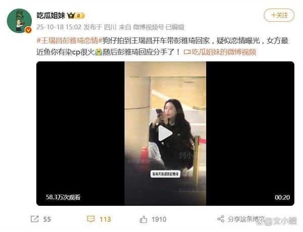 10月18日,当狗仔镜头对准王瑞昌跑车接彭雅琦收工、共进晚餐并同返住所的画面时,一场关于“恋情同居”的猜测迅速在热搜榜炸开。然而,瓜还没捂热,正主就直接下场“手撕剧本”——从绯闻曝光到正式回应,彭雅琦只用了约3小时,堪称娱乐圈公关速度卷出新高度。
