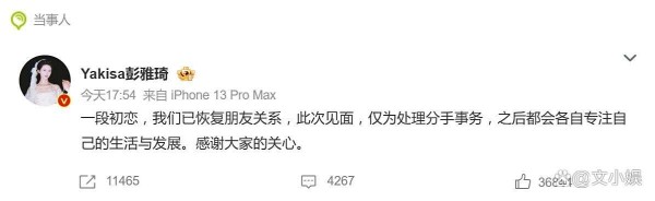 这段被拍到的“疑似恋情”,视频中两人刻意保持距离,毫无亲密举动,彭雅琦甚至穿着当日录歌的工作服。有网友调侃:“这氛围,说是前任开会我都信。”果然,彭雅琦的个人声明干脆利落:“一段初恋,我们已恢复朋友关系,此次见面,仅为处理分手事务。”