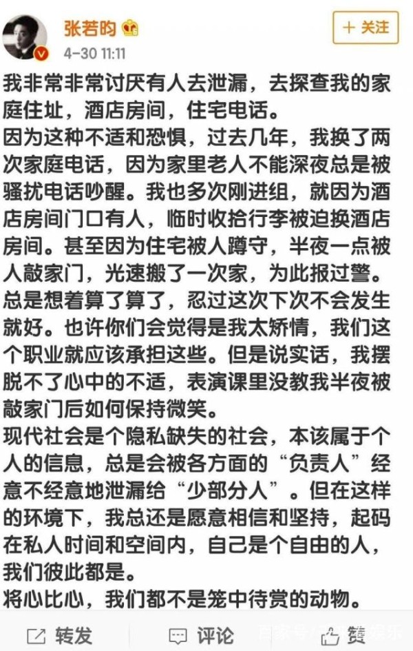 还有小编非常喜欢的一位演员张若昀,他曾在自己微博中发表一篇文章专门强调了一下“非常讨厌别人泄露、探查他的家庭住址、酒店房间、住宅电话,过去几年自己甚至为此搬过家。”看来黑粉真的是让明星们很是难受!