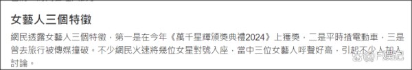 网友表示这位女艺人有3大特征,首先是刚刚获奖了,随后座驾是新能源车,还曾经和男艺人一起旅行被媒体撞破。