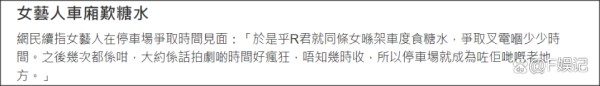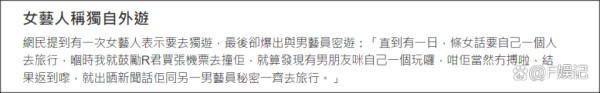 还表示有一次女艺人称是独自旅游,结果被媒体曝光是和另外一位男艺人旅游。同时更称这位女艺人原来很喜欢在车内和异性见面约会,在女艺人获奖后R再次碰到女艺人在车内和另外一位男士聊天,当时男士在喂女艺人喝糖水。
