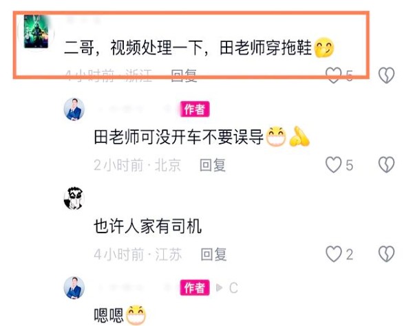 视频中的田小洁,脚踏拖鞋,虽显随意,却也不失风度。然而,有网友调侃他“拖鞋修车太随意”,甚至有人质疑“穿拖鞋开车违法”。面对这些质疑,老板幽默地回应道:“车是拖来的,田老师并未亲自驾驶。”这一解释,不仅化解了现场的尴尬,也为田小洁保留了颜面。