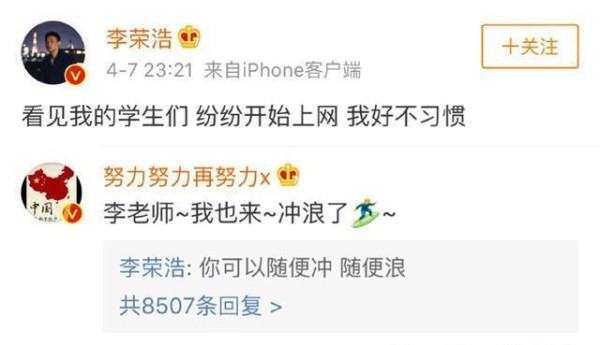围观的粉丝们一定还没有看够这些细节吧。两人因为关系之好,经常互相宣传专辑,互相捧场,还被封为了“不荣艺”组合。细细想来,两人的事业成就也确实不容易啊!再看看四月份两人的互动更是让人忍俊不禁。 李荣浩自发博文表示看见学生上网,自己感到不习惯。面对张艺兴的我也来冲浪了这样的神奇评论,他的回复更是搞笑。他回复道,你可以随便冲,随便浪。一语双关的“浪”,也让粉丝们感慨两人的关系看起来很不错啊,时刻都能看到两人的互动。