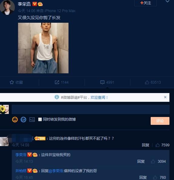 有人抱怨李荣浩,这是穷得连一件像样的汗衫都买不起吗?不料李荣浩居然回复,这是井宝给我买的。接着井柏然也在评论区留言,痞帅的没有人,我的哥哥,看来两人的关系还是很好的。