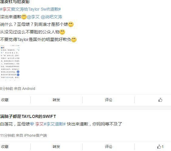 因为这件事情,霉霉的粉丝希望李艾可以道歉。但是并没有得到回应。同时也有看过节目的观众说去年播出的节目其实内容并不是全然的抨击本身没有说diss霉霉的意思。