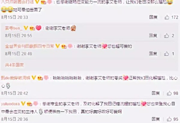 在最近主持活动的时候,田馥甄作为嘉宾记错流程在介绍嘉宾的时候就登上了舞台。田馥甄自己还非常尴尬的说,自己是不是记错流程了。而作为主持人的李艾非常的机智的化解了田馥甄的尴尬,在活动之后很多田馥甄的粉丝都到李艾的微博里向李艾表达了感谢,盛赞她是优秀的主持人。
