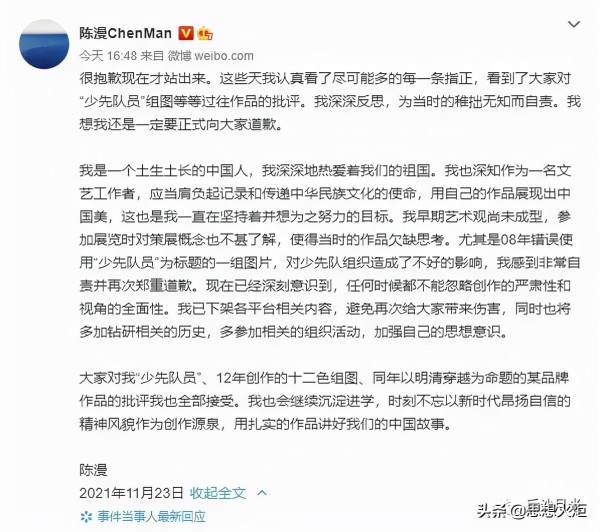陈漫说自己“认真看了尽可能多的每一条指正”,为自己的“少先队员”系列等以往作品进行道歉和反思,并声明全部下架,还有一些个人思想剖析。