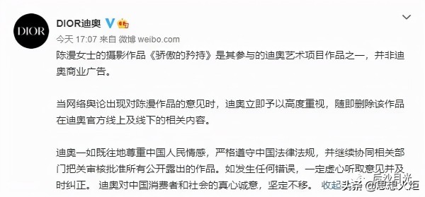 在陈漫公开道歉过了20分钟左右,另一个当事方-迪奥,也发表了一份声明。
