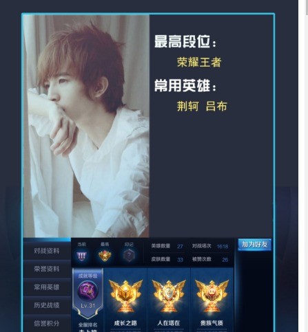 第三名:胡夏最高段位:荣耀王者胡夏从LOL到《王者荣耀》都十分精通,据说他不仅和其他明星组团开黑,还拜师《王者荣耀》职业战队XQ选手AT学习操作技术和思路,游戏记录显示胡夏已经玩了5000多场了,如此勤奋好学,难怪连续三个赛季段位达到最强王者了。2016年11月,胡夏还作为神秘嘉宾做客《王者荣耀》职业联赛KPL现场,给网友奉上了一次精彩的解说。
