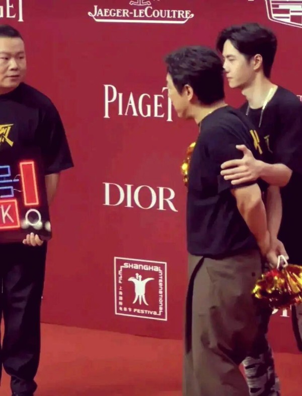 6月17日,王一博与黄渤、岳云鹏等人在上海电影节的红地毯上合影。在拍照的一刹那,他发现自己竟然站在了中间的核心位置,顿时感到有些手足无措。毕竟,站在他两旁的分别是资历深厚的黄渤和岳云鹏,他们的辈分显然都高于他。