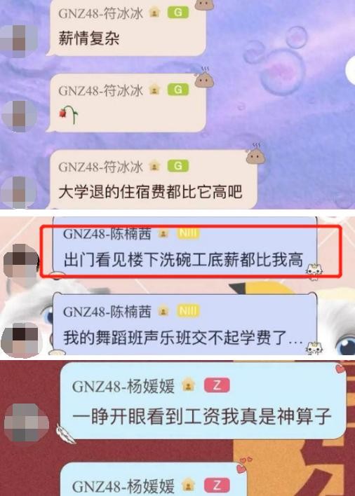 例如之前就曾有女团成员自嘲过自己到手的月工资,从下图可以看到,有成员表示工资不如洗碗工,连大学时期的生活费、退的住宿费都比工资高,甚至还有成员直接表明自己到账的工资也就五百左右。啊这...前后工资的差距也实在是太大了,从几百万到几百块的高跨度,这能到手的工资也着实让大家一言难尽啊。