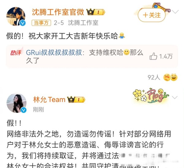 还有人讲,他俩越是看起来毫无关联,反而越有可能是真的。怎么没听说和贾玲、马丽传恋情,却偏偏和林允传呢?沈腾与马丽、贾玲是搭档关系,和林允在荧幕上几乎都没合作过,这样传难道不是造谣吗?没有证据支撑的事情都是假的!