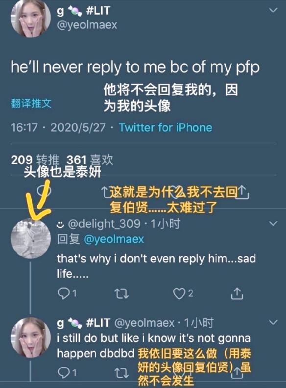 这位粉丝表示,她原本只是因为个人喜好而将头像设置为泰妍,并未料想到伯贤会主动回应。