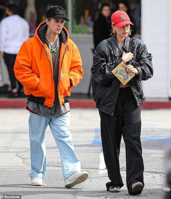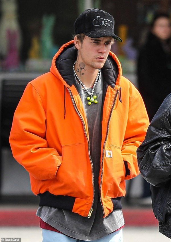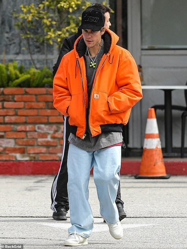 贾斯汀·比伯穿着一件明亮的黑色和橙色卡哈特连帽衫,里面穿一件深灰色的 T 恤,搭配宽松的浅蓝色牛仔裤和纯白色运动鞋,颈间戴着一条看起来很奇怪的项链。