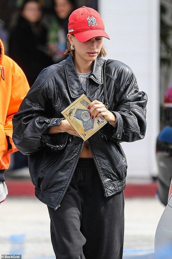 海莉则穿得相当黯淡无光,黑色夹克搭配黑色休闲裤,把自己完全包裹起来。