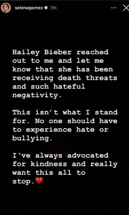 赛琳娜刚刚在 INS 发帖:“Hailey Bieber联系我,告诉我她一直受到死亡威胁和负面情绪的困扰。这不是我所支持的,没有人应该遭受仇恨或霸凌。我一直倡导善良,希望这一切都能停止。”