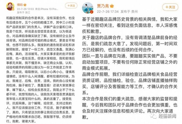 7月26日贾乃亮发文表示,没有背调清楚品牌的前身,并称已在第一时间解约,也没有后续的任何合作。傅首尔更是表示“不应该接这份工作,肠子都悔青了。”