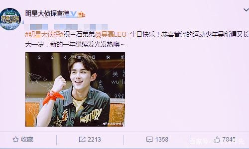 这个给吴磊发祝福的人,就是《明星大侦探》的官微,它写的是“祝三石弟弟生日快乐,恭喜曾经的运动少年吴所谓又长大一岁,新的一年继续发光发热啊”。
