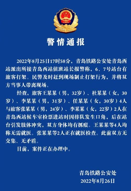 每人身上都有抓伤,但只有张照洋二人需要验伤,其他四人均不需要就医。据悉,几人是在检票进站的时候发生了口角,在站台争执中引发了肢体冲突。现在具体发生了什么口角还不知,是谁的过错也不清楚,还需要等调查结果。