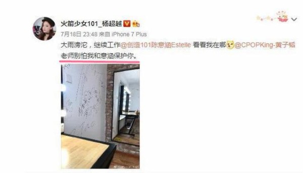 此外,这位耿直女孩在7月18日晚在微博上大胆喊话黄子韬:“别怕,我和意涵在保护你”,晒出了一张照片:在一堵签名墙上有黄子韬的名字和杨超越、陈意涵的签名,并在两人名字中间画上了两个连在一起的小心心。