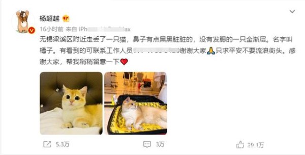 目前,从杨超越公布这样的寻猫消息差不多也17个小时了,但目前,杨超越还没有发后续,想必是还没有找到吧。根据杨超越的后续评论补充,其实在11号就已经丢失了,之所以没有发出 来,家人是怕杨超越担心,因此这时候才全网寻找。