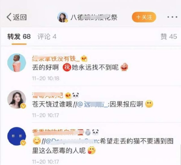 本来吴宣仪帮助杨超越,也是好事一件,就连杨超越粉丝也发文称“谢谢吴姐转发”。但不知怎么的,杨超越粉丝这边可谓是寻猫控评两手抓,一刻也不敢放松,因为吴宣仪极个别粉丝并不会真心帮忙,甚至还有人觉得,无论猫还是杨超越都是活该。也不知道,这样的念头,是因为什么而产生的。