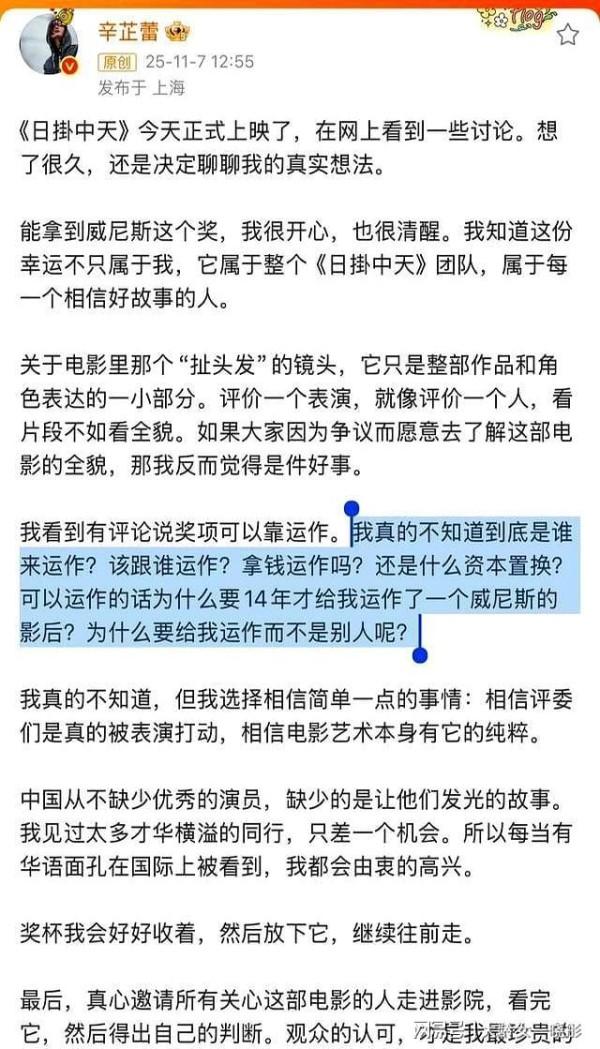她在社交媒体上的质疑,尖锐地指出了当今电影节奖项评选的标准。