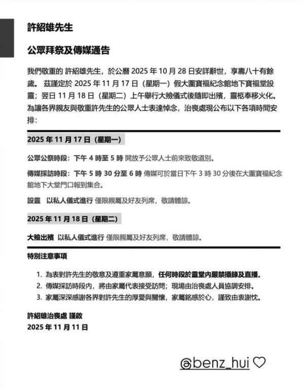 另外许绍雄的家属将于11月17日于假发围宝福纪念馆地下宝福堂设灵,同时开放公众人士前来灵堂致意表达哀思。