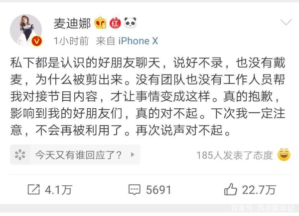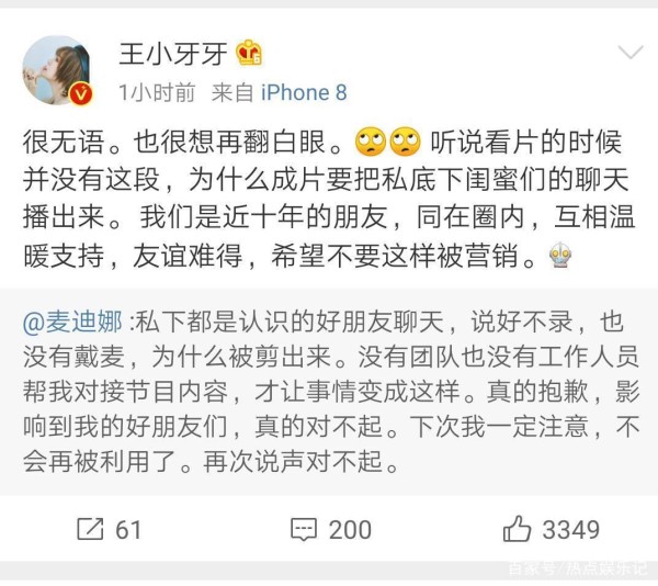 在麦迪娜发文澄清后,主持人王小牙转发质疑道:“听说看片的时候没有这一段,为什么成片要把私底下闺蜜们的聊天播出来?”同时王小牙还表示:“同在圈里,我们能成为十年的朋友,友谊很难得,希望不要这样被营销了”。