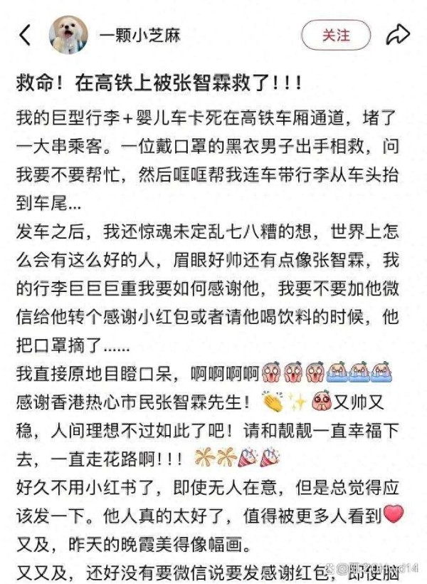 来,大伙先别急着划水,这事儿要是搁咱们身边,估计都得竖大拇指高铁上,一个小宝妈拖着婴儿车和一堆行李,在过道被卡得死死的,眼看就要上演“高铁版堵车事故”,谁能想到这桩“过道囧途”,却硬是成了香港顶级男神张智霖的温情现场!你说,咱们平时不是总吐槽娱乐圈“明星偶像是纸糊的”,结果人家张智霖直接用实际行动亮出一把“善良大杀器”,硬是把粉圈的滤镜给升级了。这事儿火到什么地步?网友恨不得给他买10只爱马仕奖励,说实话,能让全网狂点赞,除了神颜,这点人品,根本就是无敌了吧!可问题来了咱现在还需要靠偶像来拯救高铁堵路吗?明星大咖一出场,谁的修养谁顶得住,这背后到底藏着点啥?不妨一起扒一扒。
