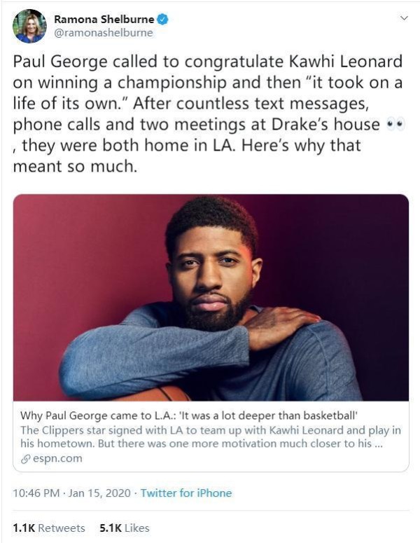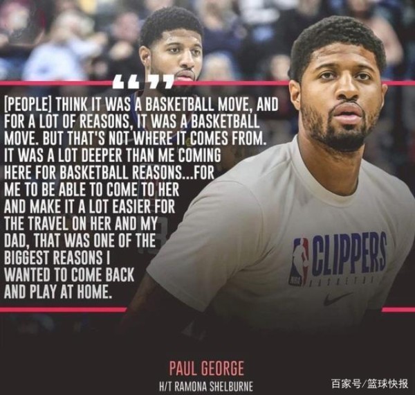 事情讲到这听上去,保罗乔治加盟快船是一个基于篮球层面的决定,他想要去更有竞争力的球队。但是篮球层面并不是驱使保罗乔治做决定的主要原因,Ramona在文中引用了保罗乔治的原话,乔治如是说道:“因为很多原因,那是一件篮球层面的事情,但那不是我驱动我回乡的动力。我选择回洛杉矶的原因,比篮球层面要深得多。”