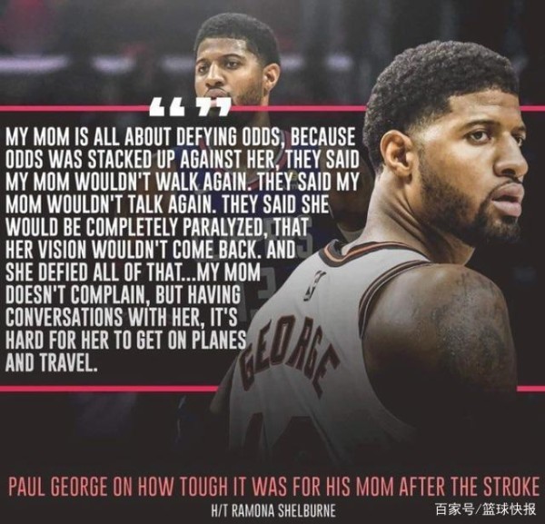虽然,保罗乔治的妈妈如今身体已经好转很多,但是坐飞机长途跋涉去看自己的儿子比赛,对于她来说还是太艰难了,她的身体无法承受旅途的劳累。为了能够离自己的妈妈近一点,乔治一直很想回家乡洛杉矶球队效力,这样自己的母亲就可以跟着父亲一起到现场看自己打球!对此,乔治说道:“对我来说,让她和爸爸来看我打球时旅途轻松一些,是我选择回家乡打球的最大原因之一。”