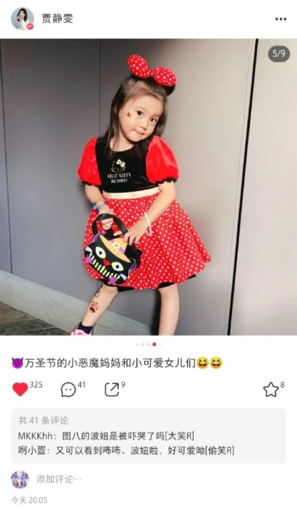 而在11月2日,贾静雯在社交网站上又一次分享女儿万圣节的新照片,除了提前过节的造型外,万圣节当日也换了一身新的衣服,孩子们的节日妈妈们总是要费尽心思。