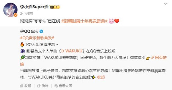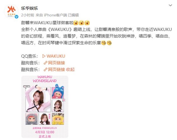 @乐华娱乐 官方发文称:甜馨来WAKUKU星球做客啦!全新个人单曲《WAKUKU》趣萌上线,让甜馨清泉般的歌声,带你走近WAKUKU的奇幻旅程,乘着风,追着梦,在森林的臂膀里开始欢脱神游,唱四季、唱自由、唱远方,在时间琴键中滑过探索生命的乐章。