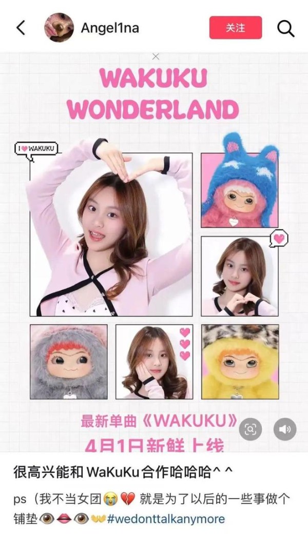 随后,甜馨在社交平台发文称:“很高兴能和WAKUKU合作,PS(备注):我不当女团,只是为以后的一些事做铺垫。”