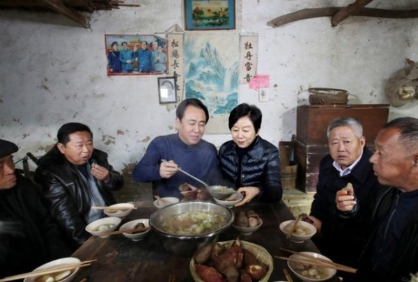 地瓜、黑窝头、煮白菜萝卜、地瓜汤,许家印夫妇在堂屋和父老乡亲一起吃忆苦思甜饭。普通工人家庭出身的丁玉梅感慨,“35年前和许家印回家结婚时,村里那个穷啊,现在变化真大。”