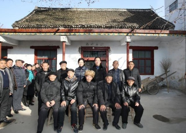 许家印和妻子丁玉梅回到太康县高贤乡聚台岗村,和长辈、小时同伴在自家院子里合影。