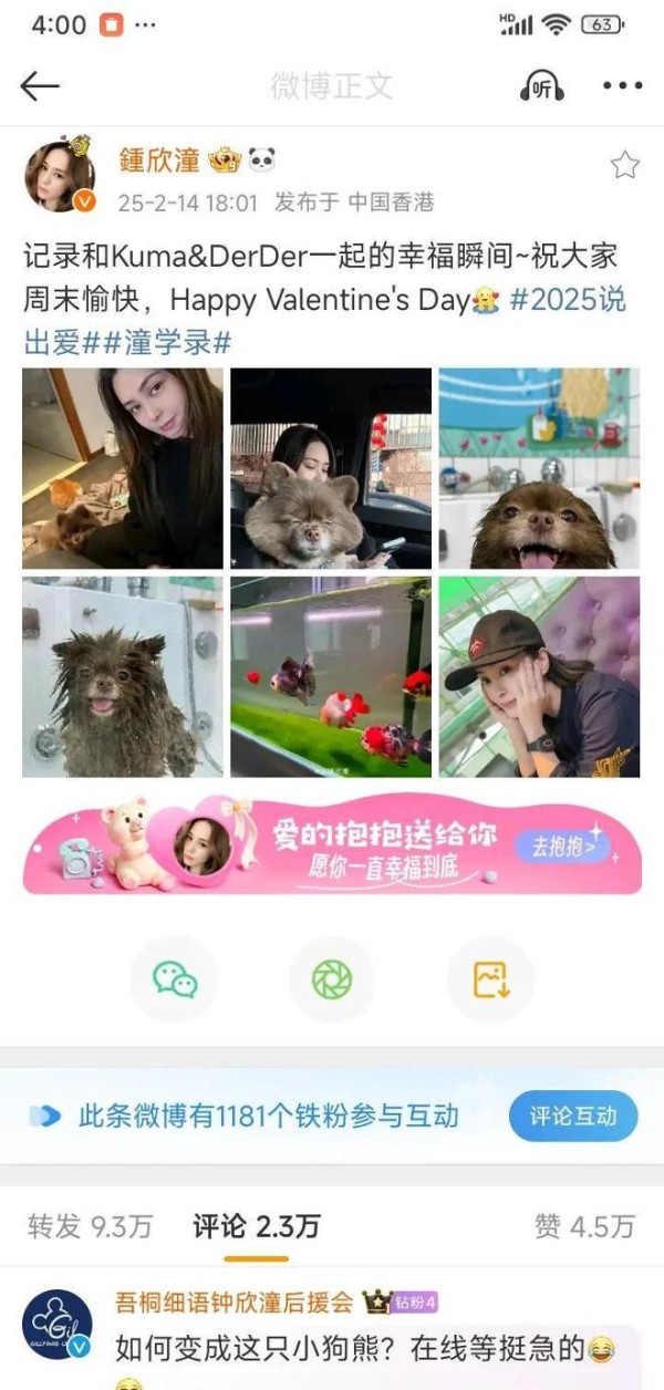 44岁钟欣潼2月14日情人节发文记录和kuma&DerDer一起的幸福瞬间,祝大家周末愉快!情人节快乐。