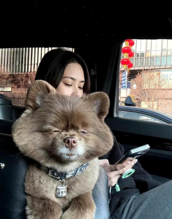 这只小狗狗长的太可爱了吧,棕色的毛脸圆圆的,像只小狗熊。还为它配备了漂亮的狗链。钟欣潼坐在车上时,也把它带在身边,太宠爱它了。毕竟美女也会有孤独的时候,孤芳自赏,有只小狗狗陪伴也是不错的。