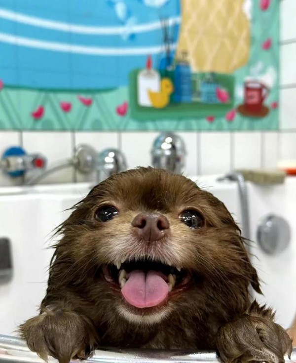 钟欣潼还亲自为小狗狗洗澡,小狗伸着舌头,两只眼睛像葡萄,两只爪子趴在浴池上,太会享受了,把它泡在浴池里,每天把它洗的香喷喷的,真是狗生赢家。