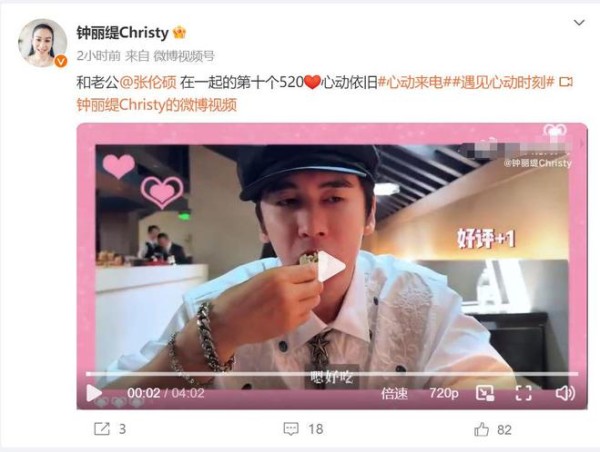 近期,钟丽缇在社交平台上分享了他和张伦硕的520纪念视频,展示了与丈夫张伦硕的深厚爱意。