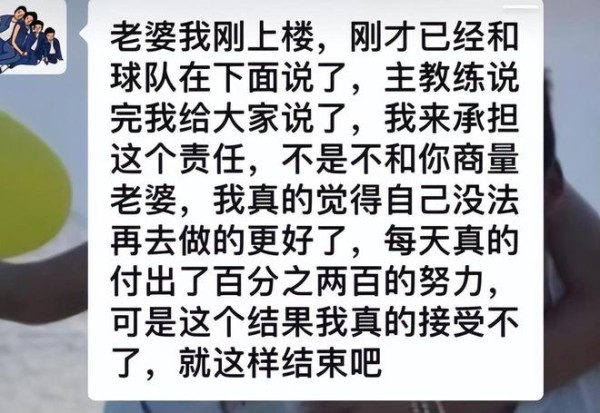 张琳芃在聊天记录中表示——老婆我刚上楼,刚才已经和球队在下面说了,主教练说完我给大家说了,我来承担这个责任。不是不和你商量老婆,我真的觉得自己没法再去做的更好了,每天真的付出了百分之两百的努力,可是这个结果我真的接受不了,就这样结束吧。