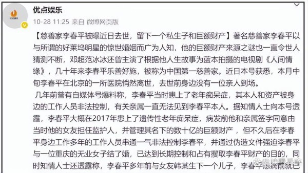 慈善家李春平女友首发声!否认他去世,求让10岁儿子见爸爸最后一面与69岁女星相处13年,得268亿遗产的李春平,晚年生活却很凄惨