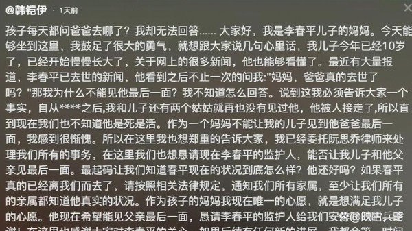 目前,韩铠伊已正式授权代理律师负责处理相关事务,期望李春平的法定监护人能够安排孩子与其父亲进行最后的会面。