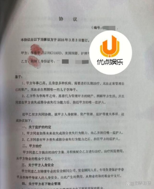 根据优点娱乐近期披露的相关资料显示,2016年韩铠伊与李春平之间曾签署一份有关财产安排的协议文书。